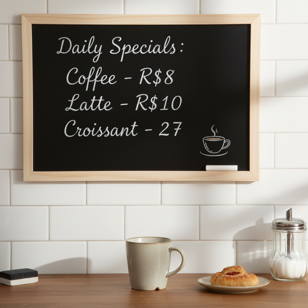 Perfeito para cafés, cozinhas, escritórios e áreas de estudo. Utilize para escrever lembretes, listas de tarefas, mensagens inspiradoras ou menus do dia. Também é uma ótima opção decorativa em casas e estabelecimentos comerciais.